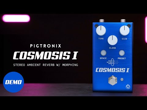 Cosmosis 1 is a high-fidelity digital reverb that delivers premium ambient reverb sounds in a streamlined, single-footswitch enclosure. Cosmosis 1 contains three unique Pigtronix space algorithms with onboard controls for the size of the reverb, wet/dry blend, and filtering. Custom-made LED touch switches provide instant color-coded access to three unique reverb spaces as well as three user-defined presets. Theatre (blue) puts the player in a variable room that ranges from cozy to highly reflective using multiple parallel short reverberators. Temple (amber) occupies a dramatic, large indoor space by implementing numerous long reflections in both parallel and series. And Cosmos (purple) creates an enormous spectrum of heavenly reverb derived from the harmonic content it’s fed.