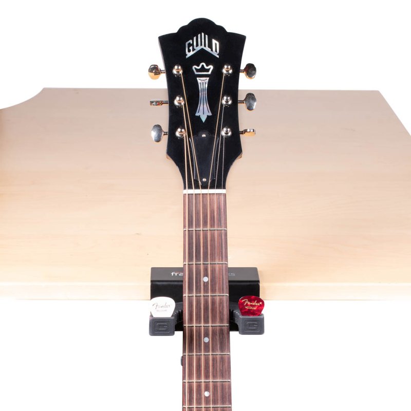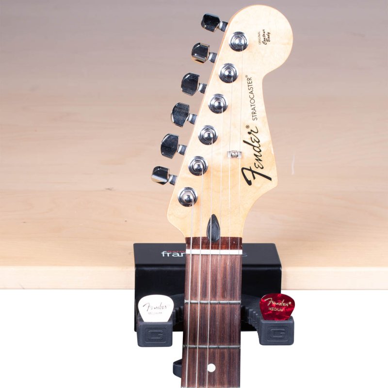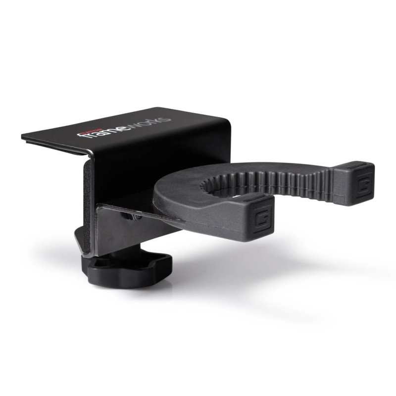 Let’s face it. We’re all guilty of at least one count of criminal guitar neglect: propping our beloved guitar up against a wall or table “just for a second...” only to see it crash to the ground seconds later. Before you can react, your precious axe is lying face to the floor, the open strings still screaming in overtones, “How could you?” And despite our promise to break this bad habit, we catch ourselves (and sometimes our guitars) doing it again and again. To avoid the potential for further damage, the clamping guitar rest by Gator Frameworks keeps your instruments out of harm’s way. The GFW-GTRDSKCLAMP-1000 clamps directly to any tabletop or studio desk edge up to 1.7”/43mm-thick, giving you a perfectly convenient solution for temporarily storing your guitar in between takes. The guitar rest will accommodate neck widths up to a maximum of 2.5”/64mm-wide and provides dual pick slots for quick access to guitar picks. To prevent slippage or surface edge damage, the clamping area is lined with 5mm-thick EVA foam padding for safe mounting. |