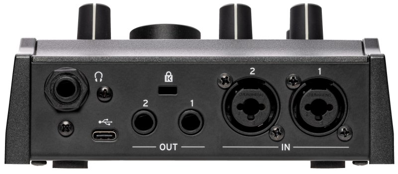 Features: IN 1, 2 jacks (XLR/6.3 mm TRS monaural phone jack), OUT 1, 2 jacks (6.3 mm TRS monaural phone jacks), (USB) port (Type-C), (headphones) jack (6.3 mm stereo phone jack), MIDI IN jack, MIDI OUT jack (3.5 mm TRS phone jack)