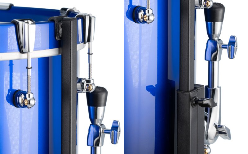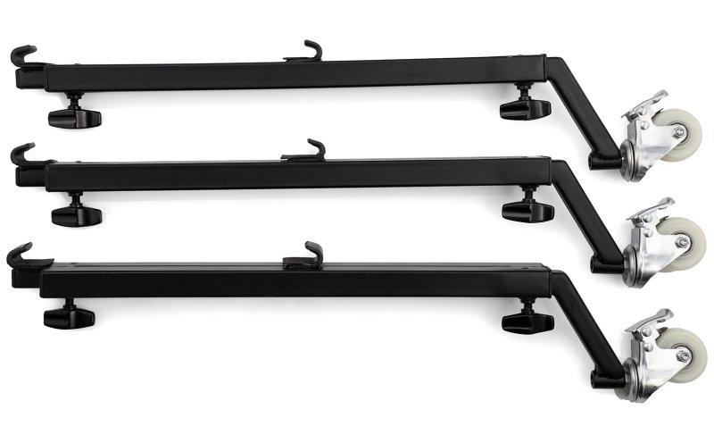The set includes 3 height and angle adjustable legs, made to fit any wood hoop drum measured edge to edge on the hoops from 10.5 -26" while still allowing for independent height and tilt adjustment on any diameter drum. This non-invasive, non-permanent compact leg design is perfect for solo chamber music, concert ensembles, marching sidelines, and in the stands – anywhere you need a drum flat. The set installs in roughly 30 seconds and collapses to smaller than a standard cymbal stand for easy transport. The full-length double hoop clamping system of the Pearl Multi-Fit Legs are sturdier than other imitation devices that clamp to only one hoop. Convenient, quick, and now equipped with wheels, the PM-BDL3W Multi-Fit Bass Drum Legs allow for easier use in any situation.
