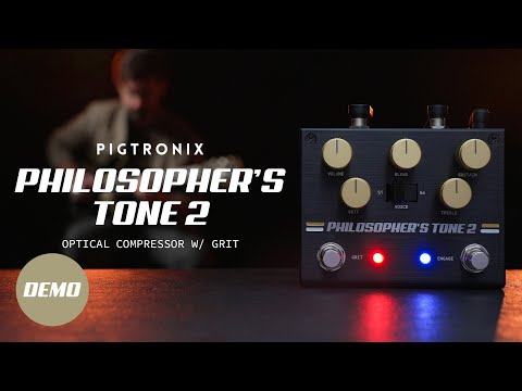Elevating the groundbreaking optical compression of the original Philosopher’s Tone to a new plane of tonal enlightenment, the Philosopher’s Tone 2 is a world-class compressor/sustainer with footswitchable Grit, allowing for more versatility than ever before. Featuring a refined implementation of the overdrive circuit first heard in the limited-edition Gold version of this iconic compressor pedal, the unique germanium distortion found in the Philosopher's Tone 2 delivers smooth top end and rich midrange response, tailored to perfectly match the characteristics of the optical sustainer driving it. In addition to Volume and Sustain controls, the Philosopher’s Tone 2 features a parallel clean Blend knob that allows musicians to mix their instrument’s original tone with the compressor/sustainer effect when the Grit circuit is bypassed. This mixing technique restores natural pick-attack and allows clean settings with extreme sustain to remain dynamic and musical. When the Grit circuit is engaged, the Blend knob is automatically bypassed, circumventing the compromises of the original unit and imparting a colorful distortion to your sound in both Germanium and Silicon modes. This nonlinear diode-clipping can range from subtle overdrive to overflowing distortion, all without unwanted feedback. A Treble control located just before the master Volume provides 6db of cut or boost at 2kHz for fine-tuning the frequency response of the effect. The Philosopher’s Tone 2 features true-bypass switching and internal 18V power rails for maximum clean headroom that is ideal for use with hot pickups, active bass, synthesizers and other line-level sources. Runs on 9VDC. |